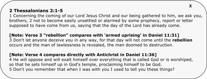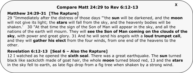 Abomination t/c Desolation Can people be saved after the rapture?The Seals and Revelationchapter-by-chapter explanation -End Times Made Easy and Complete Overview To simplify things, I summarized the main contents of this website on ‘one page’ below: 1. Proof of ‘Pre-tribulation’ rapture and correct interpretation of the Seals (next) 2. Pre-tribulation rapture supported by Matthew 24 / Disproving Post-tribs. (jump there) b. Exposing Post-tribs as false prophets 3. Post-rapture timeline from Daniel, Revelation, and more. (jump there)b. 2nd Thessalonians 2:1-5 c. Daniel 8:13-14 - The 2300-days d. The Bowl plagues and Mark of the Beast e. Daniel 12:11-12 – The 1290 and 1335 days 4. The Gog and Magog War (jump there) 5. Daniel’s 70th Seven – leading to the Abomination (jump there) 6. Daniel 11 (God’s “Book of Truth”)- ‘sealed until the time of the end’ (jump there) 7. The Significance of October 7th, 2023, and its Effect on Current Events (jump there) 8. God’s Timeline of 37’s - Muslim events (jump there) 9. God’s Timeline of 19’s - Jewish events (jump there) 10. Full moons (jump there) 1. Proof of Pre-tribulation Rapture / Correct Interpretation of the Seals This explanation of Biblical end times is the only correct way to look at things without contradictions or manipulations. It is strictly “pre-tribulation,” but contains an important difference from the previous ‘old-school’ pre-tribs who are wrong because their theory from the 1800’s has serious contradictions. Post-tribs are even worse because they overlap and re-arrange Revelation, which is forbidden by God. (Rev 22:19) My explanation of the Seals, which is supported by various scriptures, prophecies, and two 70-year periods in Jewish history, corrects both sides. Seriously, this interpretation of the Seals straightens out Revelation’s timeline for the first time, eliminating both contradictions and manipulations. In other words, both sides were wrong because no one understood the Seals. In their defense, it would have been difficult to decipher the Seals in the 1800’s, but now, so-called scholars just refuse to change from what the previous generations taught, which is obviously wrong, but this explanation is correct. It is not arrogant to say that if I can back it up with scripture, which I do. I’m not trying to boast, which is why I don’t give my name. Instead, I give all the credit to God. Anonymity is supported by the following scriptures. Click to see pop-up. (Matt 6:1-4 and John 5:43-44) So, why would God allow a nobody like me to decipher end times correctly when scholars with PHDs have failed to do so? Simple. Paul said, “God chose the foolish things of the world to shame the wise. God chose the weak things of the world to shame the strong. He chose the lowly things of this world … so that no one may boast before him.” (1 Cor 1:27-29) I am the lowly. Let me start by saying that there is no rapture in Revelation 4, which is what the old-school pre-tribs have been saying since the 1800’s. Revelation 4 is just an initial view of Heaven that was shown to John. There is no multitude of people in Revelation 4, as there is in Revelation 7:9. I’ve heard some try to account for this by saying that the 24 elders become the multitude after they lay down their crowns in Rev 4:10. However, that’s ridiculous because there’s one or more elders mentioned in Revelation 5, 7, 11, 14, and 19. The elders can’t transform into something else and still be themselves in later chapters. Besides, Revelation 5 is clearly Jesus’ crucifixion when He becomes the slain Lamb. The rapture would not be before the crucifixion. The scholars in the 1800’s just picked Revelation 4 because they wanted a spot before the Seals, since they thought the Seals were part of tribulation, which is untrue (more on that later). I admit, the Seals would have been hard to interpret in the 1800’s (much easier post-WWII), but they should have known better than to put the rapture before the crucifixion. Modern pre-tribs should be honest with themselves and correct past mistakes. One mistake that pre-tribs and post-tribs both make is that they insist that the Seals are in the future, but Seals 1-5 were during the past 2000 years. To start with, they both try to say that Seal 1 is the antichrist or Satan (starting the tribulation), but the Rider on the White Horse is clearly Jesus, since Jesus is clearly the Rider on the White Horse in Rev 19:11-16. Note: That’s ‘scripture verifying scripture’, which scholars usually try to emphasize, except when it contradicts their claims. Then, they try to ignore it. Anyway, Seal 1, in Rev 6, is clearly Jesus’ resurrectionbecause it not only matches Rev 19, but it perfectly follows the crucifixion in Rev 5. I’ve heard some try to dispute this obvious connection by saying that the two riders have different weapons. Yet, that’s a ridiculous attempt to justify past mistakes because they represent Jesus at different times: Seal 1 is the resurrection and Revelation 19 is Armageddon, over 2000-years later, so a different weapon is irrelevant. Both the old-school pre-tribs and post-tribs won’t admit that Seals 1-5 are in the past because it completely destroys their whole theory of end times. Yet, I think the Bible clearly shows that Seal 1 was the resurrection and I will explain the rest of the Seals below with more Biblical proof. Seal 2 was the three Jewish revolts, which spanned from 66 AD to 136 AD. Notice the 70-year span, which I think God planned as proof at the proper time. Also, the first revolt, 66 AD to 70 AD, resulted in the destruction of the 2nd Temple, which Jesus prophesied in Matthew 24:2. The third Jewish revolt, 132 AD to 136 AD, resulted in the total banishment of the Jews from Palestine, which fulfilled the first part of Jeremiah 16:14-15 because they had to be banished before they could be restored to their own nation again. So, given the fact t