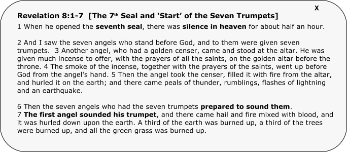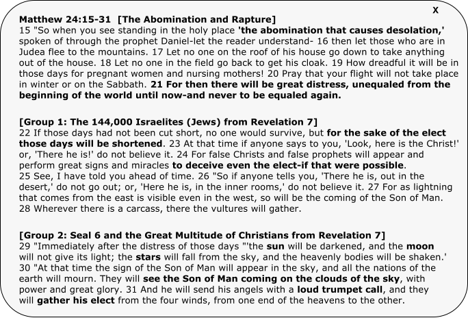 Daniel 11 TimelineCondensed ‘one page’ Commentary Video overview (36min)Abomination t/c Desolation The 70th Seven Matthew 24 explainedCan people be saved after the rapture?The Seals and Revelationchapter-by-chapter explanation -End Times Made Easy and Complete Overview To simplify things, I summarized the main contents of this website on ‘one page’ below: 1. Proof of ‘Pre-tribulation’ rapture and correct interpretation of the Seals (next) 2. Pre-tribulation rapture supported by Matthew 24 / Disproving Post-tribs. (jump there) b. Exposing Post-tribs as false prophets 3. Post-rapture timeline from Daniel, Revelation, and more. (jump there)b. 2nd Thessalonians 2:1-5 c. Daniel 8:13-14 - The 2300-days d. The Bowl plagues and Mark of the Beast e. Daniel 12:11-12 – The 1290 and 1335 days 4. The Gog and Magog War (jump there) 5. Daniel’s 70th Seven – leading to the Abomination (jump there) 6. Daniel 11 (God’s “Book of Truth”)- ‘sealed until the time of the end’ (jump there) 7. The Significance of October 7th, 2023, and its Effect on Current Events (jump there) 8. God’s Timeline of 37’s - Muslim events (jump there) 9. God’s Timeline of 19’s - Jewish events (jump there) 10. Full moons (jump there) 1. Proof of Pre-tribulation Rapture and correct interpretation of the Seals First of all, this is not the same old incorrect interpretation that old-school pre-tribs have adhered to since the 1800’s. This is really the ironclad truth because it provides an original interpretation of the Seals that is supported by several scriptures, prophecies, and two 70-year periods in Jewish history. This interpretation of the Seals straightens out Revelation’s timeline for the first time, eliminates discrepancies from the previous pre-tribs, as well as manipulations from the post-tribs. In other words, they are both wrong and I can prove it. That may sound bold, but it’s true. I was recently accused of being prideful (by someone I knew) for even suggesting that scholars with ‘PHD’ after their names were wrong and I was right. Yet, those PHDs are just learning what the previous generation taught, which was wrong to begin with. None will stand up for the truth because they are scared of getting kicked out of their particular denomination. How often were the religious scholars in the Bible such as the Pharisees ever correct in their interpretations? Why would someone think that modern times would be any different? God is the same. Paul said, “God chose the foolish things of the world to shame the wise. God chose the weak things of the world to shame the strong. He chose the lowly things of this world … so that no one may boast before him.” (1 Cor 1:27-29) I’m not trying to boast; I’m just standing up for the truth. Biblical end times is like a math problem (systems of equations), but when everything fits together and you’ve checked it multiple times, you can be confident that it’s right. Confidence is not the same as pride because I’m not hyping myself. Personally, I’m remaining anonymous, which is based on Biblical principles (see Matt 6:1-4 and John 5:43-44). I’m not anonymous because I’m ashamed or unsure of my findings, but because I don’t want to take any credit away from God who is really responsible. I know what I know because God has blessed me with that knowledge. I think it would be a disservice to God’s blessing to act wishy-washy and unsure when I’m actually very sure. Anonymity is the only way I know to remain humble while exhibiting the necessary confidence to get God’s message across. I hope everyone understands. To God be the glory. Let me start by saying that there is no rapture in Revelation 4, which is what the old-school pre-tribs have been saying since the 1800’s. Revelation 4 is just an initial view of Heaven that was shown to John. There is no multitude of people in Revelation 4, as there is in Revelation 7:9. I’ve heard some try to account for this by saying that the 24 elders become the multitude after they lay down their crowns in Rev 4:10. However, that’s ridiculous because there’s one or more elders mentioned in Revelation 5, 7, 11, 14, and 19. The elders can’t transform into something else and still be themselves in later chapters. Besides, Revelation 5 is clearly Jesus’ crucifixion when He becomes the slain Lamb. The rapture would not be before the crucifixion. The scholars in the 1800’s just picked Revelation 4 because they wanted a spot before the Seals, since they thought the Seals were part of tribulation, which is untrue (more on that later). I admit, the Seals would have been hard to interpret in the 1800’s (much easier post-WWII), but they should have known better than to put the rapture before the crucifixion. Modern pre-tribs should be honest with themselves and correct past mistakes. One mistake that pre-tribs and post-tribs both make is that they insist that the Seals are in the future, but Seals 1-5 were during the past 2000 years. To start with, they both try to say that Seal 1 is the antichrist or Satan (starting the tribulation), but the Rider on the White Horse is clearly Jesus, since Jesus is clearly the Rider on the White Horse in Rev 19:11-16. Note: That’s ‘scripture verifying scripture’, which scholars usually try to emphasize, except when it contradicts their claims. Then, they try to ignore it. Anyway, Seal 1, in Rev 6, is clearly Jesus’ resurrectionbecause it not only matches Rev 19, but it perfectly follows the crucifixion in Rev 5. I’ve heard some try to dispute this obvious connection by saying that the two riders have different weapons. Yet, that’s a ridiculous attempt to justify past mistakes because they represent Jesus at different times: Seal 1 is the resurrection and Revelation 19 is Armageddon, over 2000-years later, so a different weapon is irrelevant. Both the old-school pre-tribs and post-tribs won’t admit that Seals 1-5 are in the past because it com