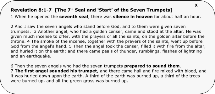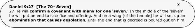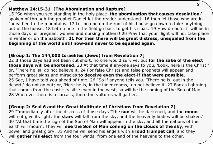 Abomination t/c Desolation Can people be saved after the rapture?The Seals and Revelationchapter-by-chapter explanation -End Times Made Easy and Complete Overview To simplify things, I summarized the main contents of this website on ‘one page’ below: 1. Proof of ‘Pre-tribulation’ rapture and correct interpretation of the Seals (next) 2. Pre-tribulation rapture supported by Matthew 24 / Disproving Post-tribs. (jump there) b. Exposing Post-tribs as false prophets 3. Post-rapture timeline from Daniel, Revelation, and more. (jump there)b. 2nd Thessalonians 2:1-5 c. Daniel 8:13-14 - The 2300-days d. The Bowl plagues and Mark of the Beast e. Daniel 12:11-12 – The 1290 and 1335 days 4. The Gog and Magog War (jump there) 5. Daniel’s 70th Seven – leading to the Abomination (jump there) 6. Daniel 11 (God’s “Book of Truth”)- ‘sealed until the time of the end’ (jump there) 7. The Significance of October 7th, 2023, and its Effect on Current Events (jump there) 8. God’s Timeline of 37’s - Muslim events (jump there) 9. God’s Timeline of 19’s - Jewish events (jump there) 10. Full moons (jump there) 1. Proof of Pre-tribulation Rapture / Correct Interpretation of the Seals This explanation of Biblical end times is the only correct way to look at things without contradictions or manipulations. It is strictly “pre-tribulation,” but contains an important difference from the previous ‘old-school’ pre-tribs who are wrong because their theory from the 1800’s has serious contradictions. Post-tribs are even worse because they overlap and re-arrange Revelation, which is forbidden by God. (Rev 22:19) My explanation of the Seals, which is supported by various scriptures, prophecies, and two 70-year periods in Jewish history, corrects both sides. Seriously, this interpretation of the Seals straightens out Revelation’s timeline for the first time, eliminating both contradictions and manipulations. In other words, both sides were wrong because no one understood the Seals. In their defense, it would have been difficult to decipher the Seals in the 1800’s, but now, so-called scholars just refuse to change from what the previous generations taught, which is obviously wrong, but this explanation is correct. It is not arrogant to say that if I can back it up with scripture, which I do. I’m not trying to boast, which is why I don’t give my name. Instead, I give all the credit to God. Anonymity is supported by the following scriptures. Click to see pop-up. (Matt 6:1-4 and John 5:43-44) So, why would God allow a nobody like me to decipher end times correctly when scholars with PHDs have failed to do so? Simple. Paul said, “God chose the foolish things of the world to shame the wise. God chose the weak things of the world to shame the strong. He chose the lowly things of this world … so that no one may boast before him.” (1 Cor 1:27-29) I am the lowly. Let me start by saying that there is no rapture in Revelation 4, which is what the old-school pre-tribs have been saying since the 1800’s. Revelation 4 is just an initial view of Heaven that was shown to John. There is no multitude of people in Revelation 4, as there is in Revelation 7:9. I’ve heard some try to account for this by saying that the 24 elders become the multitude after they lay down their crowns in Rev 4:10. However, that’s ridiculous because there’s one or more elders mentioned in Revelation 5, 7, 11, 14, and 19. The elders can’t transform into something else and still be themselves in later chapters. Besides, Revelation 5 is clearly Jesus’ crucifixion when He becomes the slain Lamb. The rapture would not be before the crucifixion. The scholars in the 1800’s just picked Revelation 4 because they wanted a spot before the Seals, since they thought the Seals were part of tribulation, which is untrue (more on that later). I admit, the Seals would have been hard to interpret in the 1800’s (much easier post-WWII), but they should have known better than to put the rapture before the crucifixion. Modern pre-tribs should be honest with themselves and correct past mistakes. One mistake that pre-tribs and post-tribs both make is that they insist that the Seals are in the future, but Seals 1-5 were during the past 2000 years. To start with, they both try to say that Seal 1 is the antichrist or Satan (starting the tribulation), but the Rider on the White Horse is clearly Jesus, since Jesus is clearly the Rider on the White Horse in Rev 19:11-16. Note: That’s ‘scripture verifying scripture’, which scholars usually try to emphasize, except when it contradicts their claims. Then, they try to ignore it. Anyway, Seal 1, in Rev 6, is clearly Jesus’ resurrectionbecause it not only matches Rev 19, but it perfectly follows the crucifixion in Rev 5. I’ve heard some try to dispute this obvious connection by saying that the two riders have different weapons. Yet, that’s a ridiculous attempt to justify past mistakes because they represent Jesus at different times: Seal 1 is the resurrection and Revelation 19 is Armageddon, over 2000-years later, so a different weapon is irrelevant. Both the old-school pre-tribs and post-tribs won’t admit that Seals 1-5 are in the past because it completely destroys their whole theory of end times. Yet, I think the Bible clearly shows that Seal 1 was the resurrection and I will explain the rest of the Seals below with more Biblical proof. Seal 2 was the three Jewish revolts, which spanned from 66 AD to 136 AD. Notice the 70-year span, which I think God planned as proof at the proper time. Also, the first revolt, 66 AD to 70 AD, resulted in the destruction of the 2nd Temple, which Jesus prophesied in Matthew 24:2. The third Jewish revolt, 132 AD to 136 AD, resulted in the total banishment of the Jews from Palestine, which fulfilled the first part of Jeremiah 16:14-15 because they had to be banished before they could be restored to their own nation again. So, given the fact t