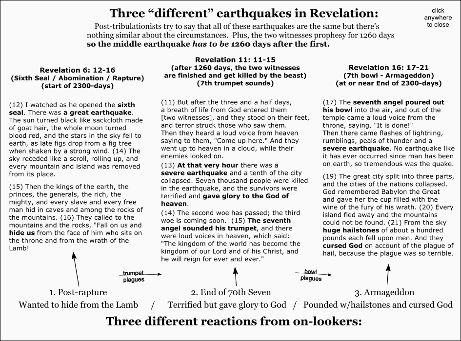 distinct earthquakes in Revelation but post-tribulationists try to overlap them into one.