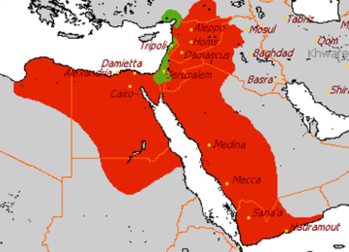 Palestine, Syria, Lebanon, and Sicily (left). As the empire declined, Turkish invaders
